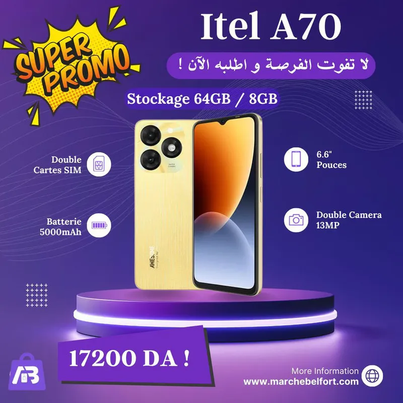 الهاتف الأكثر طلبا ✔️ 📌 هاتف مميز جدًا بمواصفات عالية : ✅️ Batterie : 5000mAh ✅️ Double Cartes SIM ✅️ L'écran : 6.6 Pouces ✅️ Double Camera 13MP ✅️ ROM 128Gb / RAM 12GB ✨️ 🚀شاشة كبيرة ✅️ : الهاتف يأتي بشاشة كبيرة الحجم مقاس "6.6✨️ الشاشة تغطي معظم مساحة واجهة الهاتف ✔️ 🚀كاميرا خلفية ثنائية 📸 : هاتف itel A70 يأتي مزود بكاميرا خلفية ثنائية بدقة 13Mp و 0.3 ، يمكنك استخدام الكاميرا لتصوير الفيديو بدقة 1080P FHD 📸💥 🚀بطارية كبيرة🔋: سعة بطارية كبيرة ✔️ تدوم مدة زمنية طويلة 5000mAh👌🏻 🚀 مستشعر البصمة✔️: الهاتف مزود بمستشعر بصمة الأصابع 👌🏻 🚀 مساحة التخزين كبيرة✅️: الهاتف يأتي بذاكرة تخزين داخلية مساحتها كبيرة👈🏻👈🏻64GB ✅️ 🚀✔️ الشرائح: الهاتف يدعم تركيب شريحتي SIM و بطاقة ذاكرة ✅️👌🏻 📌 هاتف لا مثيل له ✅️👌🏻📱 عند مارشي بلفور ✅️ التوصيل متوفر 58 ولاية 🚀 ✅️للطلب تواصل معنا عبر الخاص